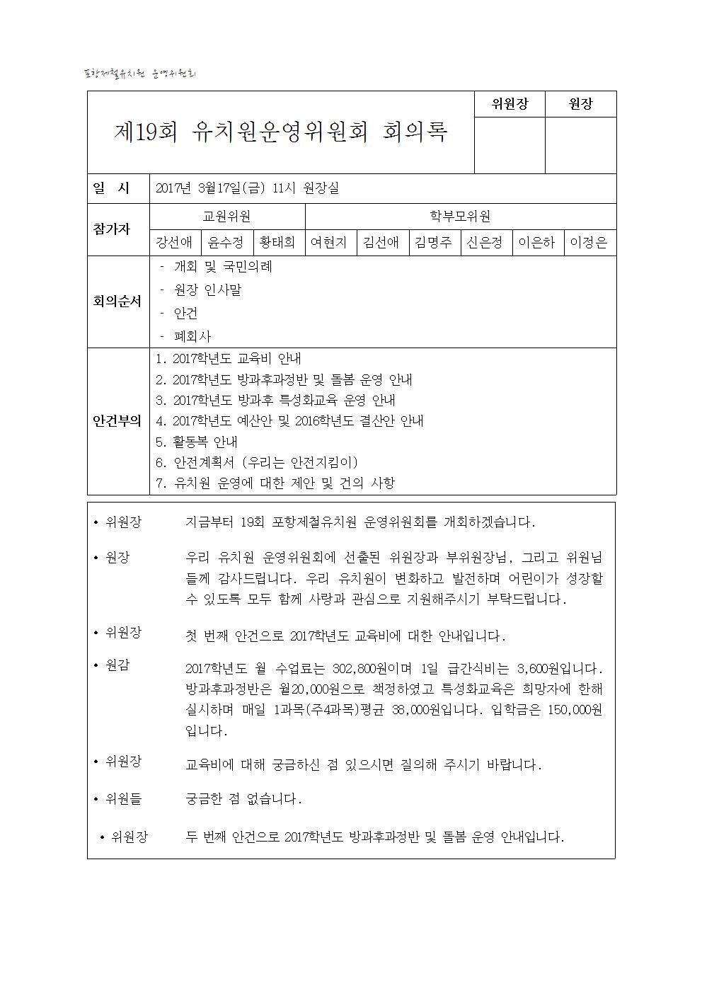 (유치원운영위원회)제19회 유치원운영위원회 회의록