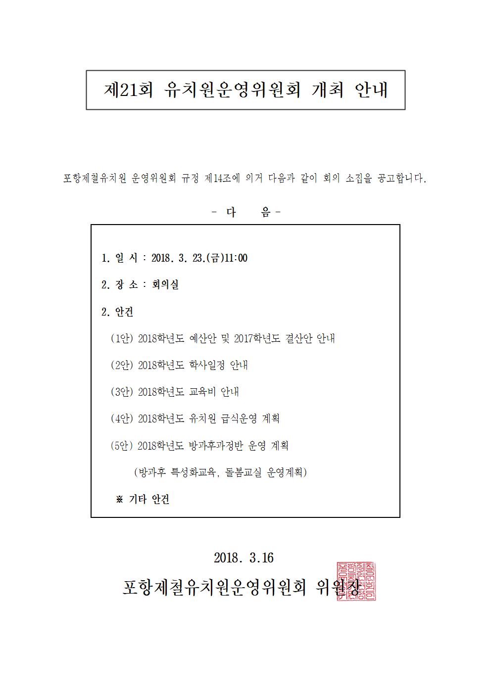 (유치원운영위원회) 2018학년도 포항제철유치원 운영위원회 구성 안내